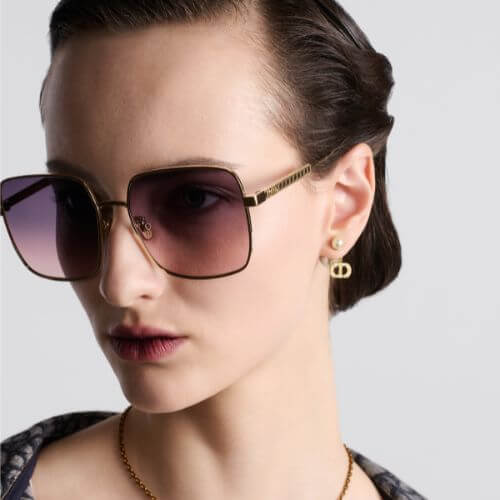The DiorCannage S1U sunglasses are an elegant style adorned with hallmark details. The gold-finish metal square frame stands out with delicate engraving on the temples showcasing the Cannage motif and CD signature. Completed by gradient purple-to-pink lenses, the sunglasses will lend a modern and refined touch to any attire.
